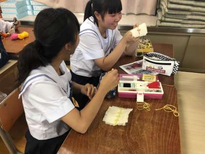 細かな作業に熱中しながら、笑顔あふれる家庭科部のみなさんです。