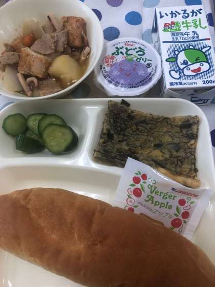 豚肉といかの煮もの、あっさりきゅうり、ぶどうゼリー、コッペパン、リンゴジャム、牛乳です。