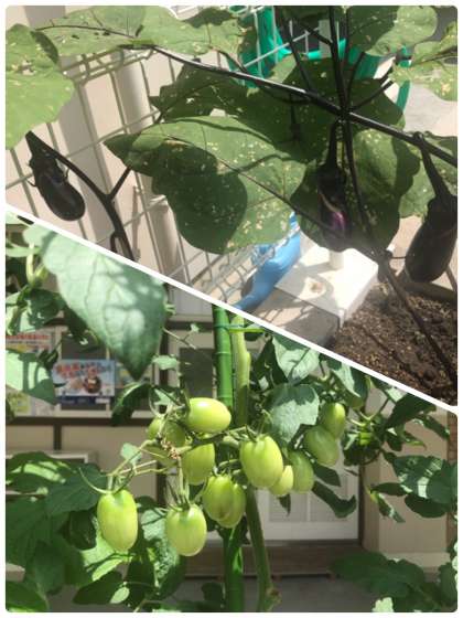 本校で栽培されたキュウリ・トマト・ナスを、収穫しています。
