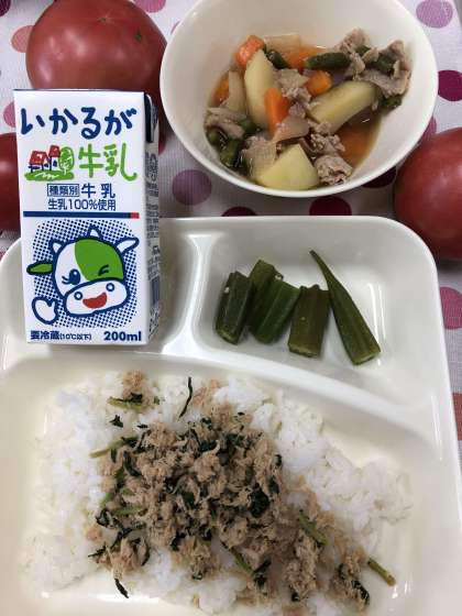 豚肉とじゃがいもの煮もの、オクラの甘酢あえ、ツナっ葉いため、ごはん、牛乳です。
