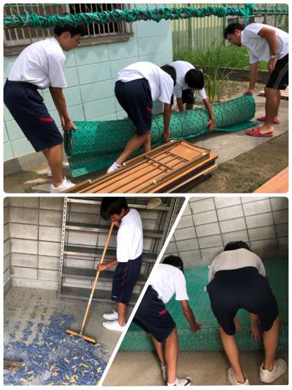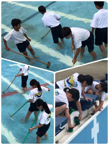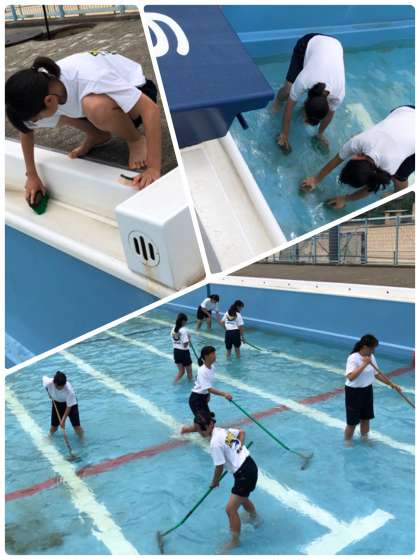 体育委員とバレー部たちが、丹念にプール壁を磨いてくれています。男子更衣室も一掃してくれています。