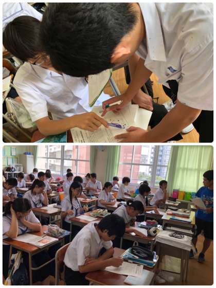 音声・流暢性・正確性・内容・態度・方略使用を3年間の見通しをもって、取り入れて学習しています。