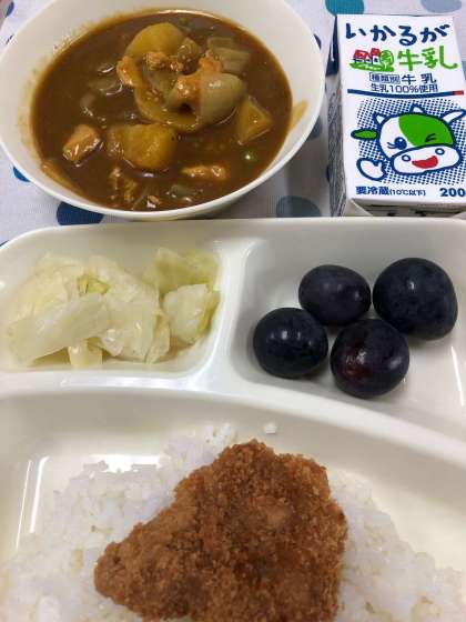 チキンカレーライス、一口ヒレカツ、キャベツのピクルス、ぶどう(巨峰)、牛乳です。