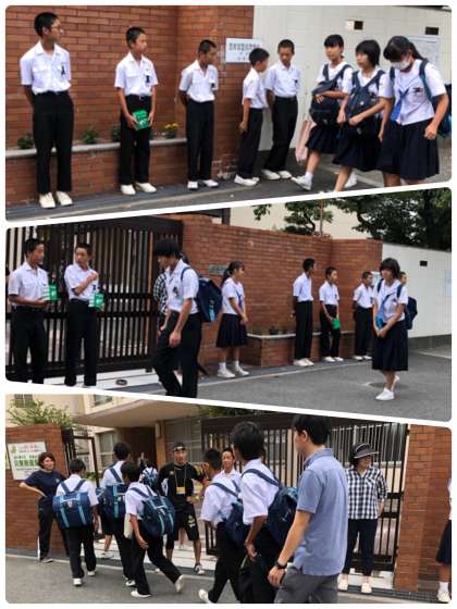 今日は、曇り空の涼しい朝です。野球部が、朝のあいさつ運動を行っています。