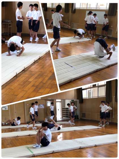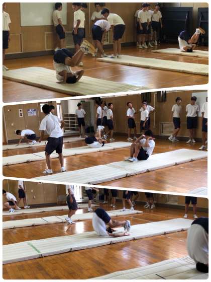 マット運動では、回転系や巧技系の基本的な技を滑らかに行うこと、条件を変えた技や発展技を行うこと及びそれらを組み合わせることをねらいとしています。