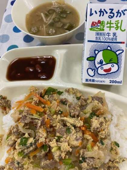 他人丼、とうがんのみそ汁、金時豆の煮もの、牛乳です。