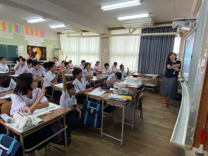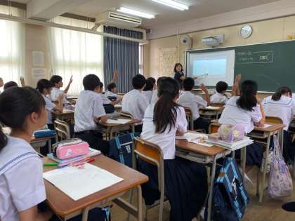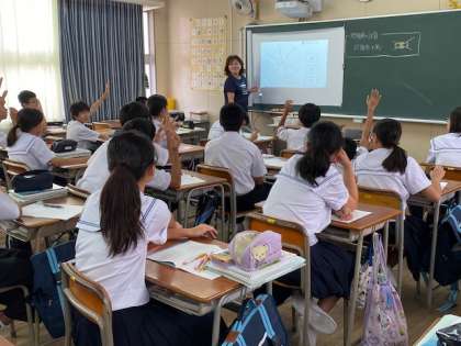 プロジェクタに映し出された問題を、生徒たちが答えています。