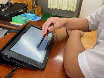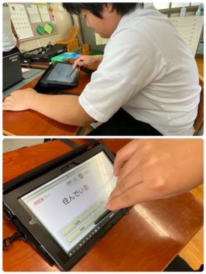 特別支援学級では、タブレット端末を活用して英語の学習を行っています。