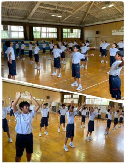 男子は、体育委員の声掛けに合わせてラジオ体操を行っています。