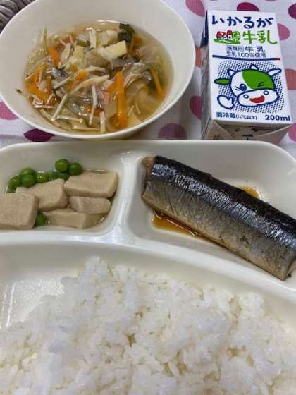 さんまのさんしょう焼き、すまし汁、高野豆腐の煮もの、ごはん、牛乳です。