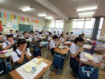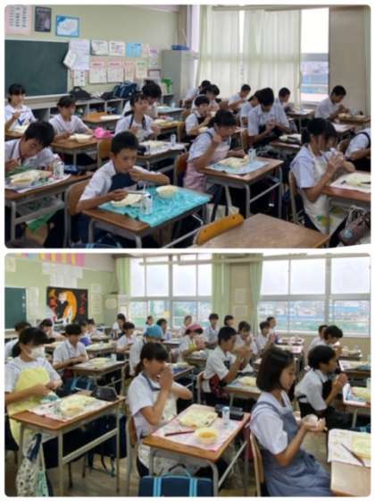 秋の食材 さんまは濃厚なたれがかかっていてとても美味しいです。上手に骨をとって食べている生徒たちがたくさんいます。