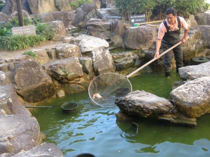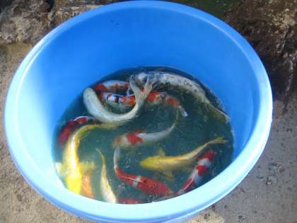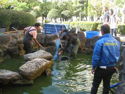 まず、池の鯉の移動から始めました。しばらくの間、鯉たちも引っ越しです。