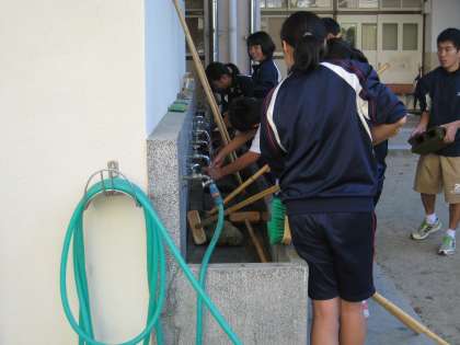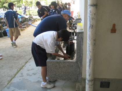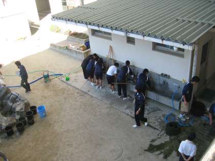池から取り出した置石やブロック、水草の鉢を子供たちと先生方がブラシできれいに洗ってくれました。