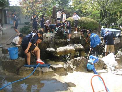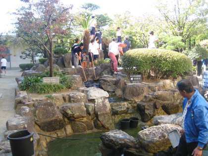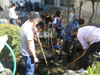 鯉の引っ越しが終わると、お父さん方と子どもたち、先生方で滝の流れ道、池の底の泥をデッキブラシできれいにしていきました。