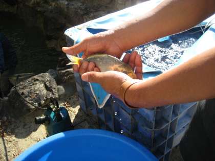 池の水を張り替え、しばらくしてから鯉を池に戻します。