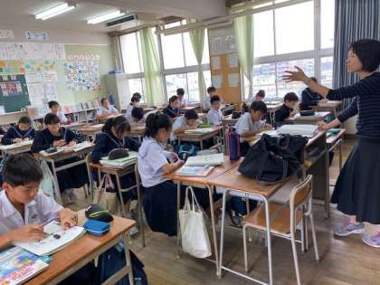 関心のある事柄について、簡単な語句や文を用いて即興で伝え合うことができるようにするねらいです。