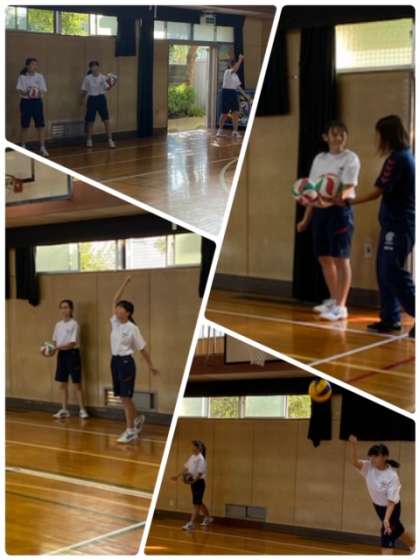 ペアになって、ネット越しにアンダーハンドサーブの練習をしています。