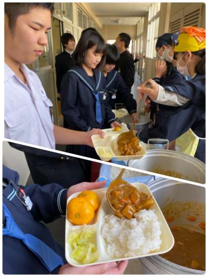 ポークカレーライス、キャベツのサラダ、みかん、牛乳です。みんな大好きなカレーは、盛り付けから大盛やおかわりがたくさんあります。