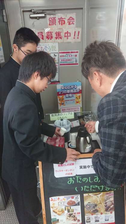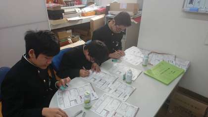 郵便局で職場体験中です。ふるさと小包のお手伝いをしています。
