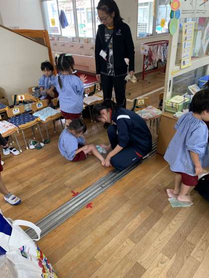 園児たちが裸足で遊んだ後に、それぞれの足をきれいに拭いています。