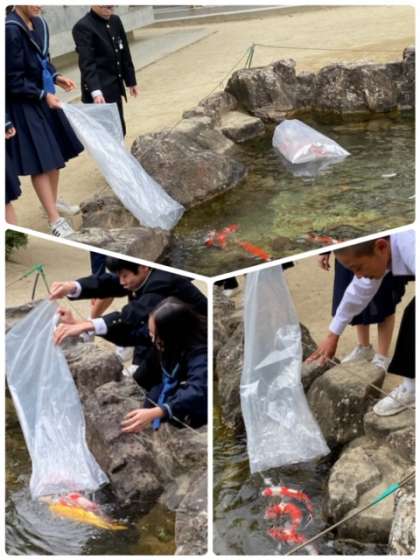 1年生の学級代表のみんなが、新たに12匹の立派な錦鯉の放流を行ってくれました。