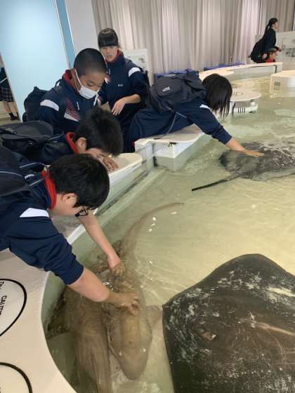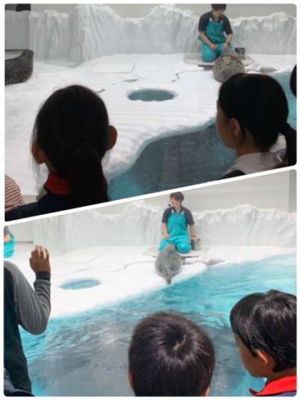 魚たちにさわれるコーナーやアザラシショーもあり、班で計画して取り組んでいます。