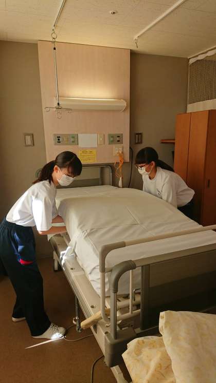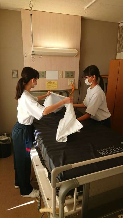 入院ベッドメイキングの仕方を教わっています。2人1組でシーツを広げて、手順通りに行うときれいに仕上がりました。