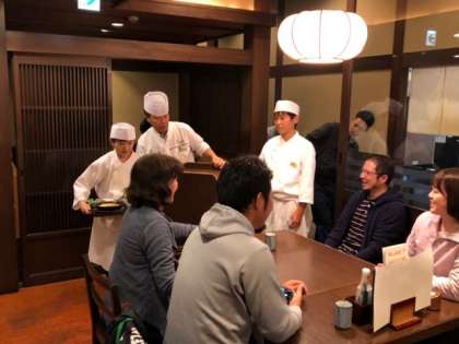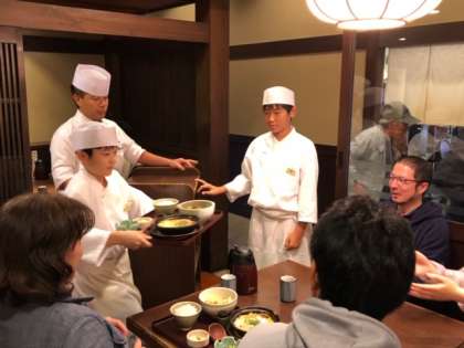 店員さんの衣装がよく似合っています。訪れた先生たちに笑顔で配膳してくれています。
