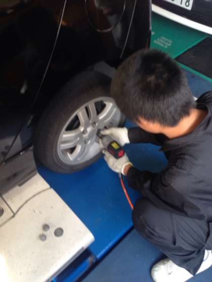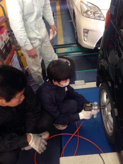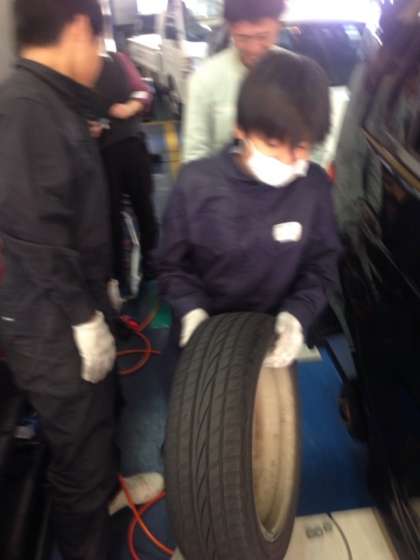 タイヤの入れ替え作業を教えてもらいながら、一緒に作業をしています。初めてタイヤを持って、とても重いことに驚いています。