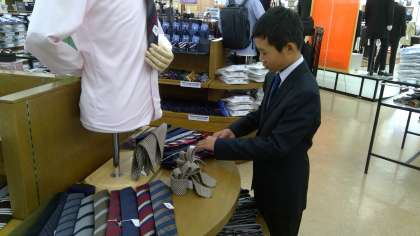 ネクタイとスーツ姿の生徒たちは、とても凛々しく見えます。展示商品の整理をしています。大人に一歩近づいたような体験ができていますね。