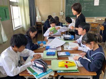 グループになり、それぞれが考えた学校について、内容を理解し評価できるようにすることをねらいとしています。