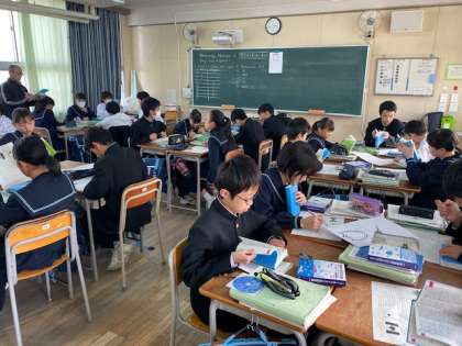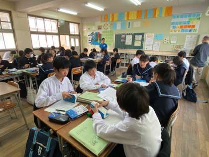 1年生の英語の授業では、自分の学校の紹介文を英文で書き発表する学習をしています。