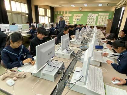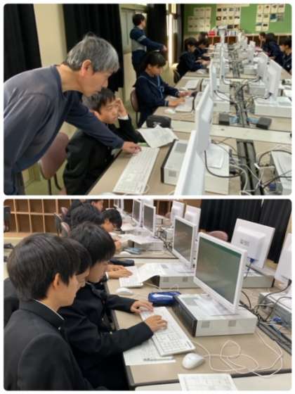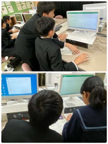 パソコン教室で、各自のパソコンにプラス面とマイナス面を入力しています。整理した内容を意見交流してまとめていきます。