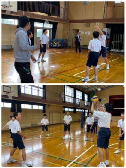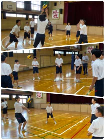 ボールをみんなでつなげるように円陣パスをし、簡易ゲームでスパイクを打てるようにすることをねらいとしています。