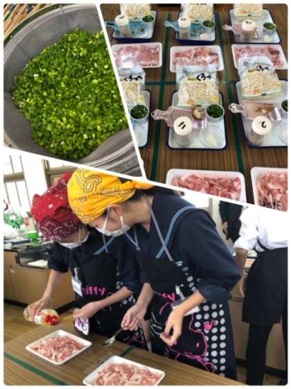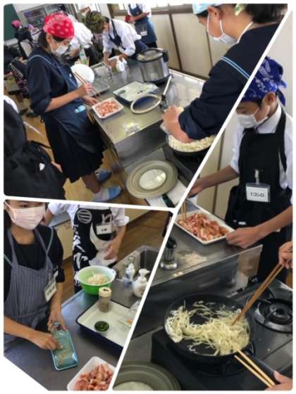 班ごとの生徒それぞれに「コンロ・調理台・床・流し台」等の役割をつけて実習を行っています。調理の行程で自分が担当する役割が十分に果たせるのかも学習です。