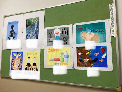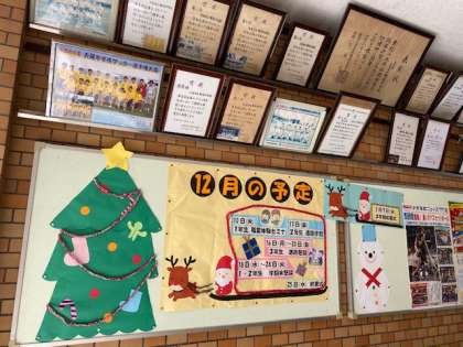 本校の掲示板等に生徒作品や季節感あるものが飾られています。生徒たちの学習活動の成果が見られることはとてもいいことですね。