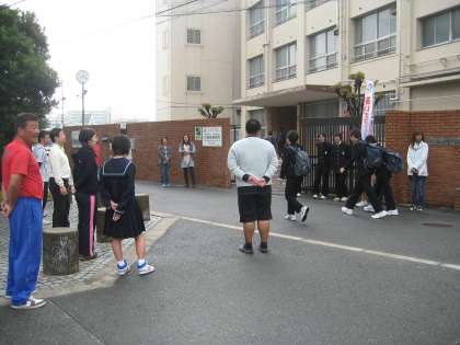 正門では、保護者の皆さん、風紀委員の生徒、そして先生方が一つになって取り組んでいる様子に、改めて、横堤の保護者・学校の連携の深さを感じました。