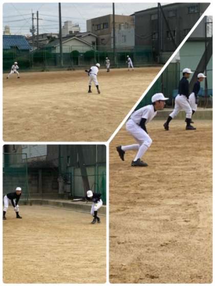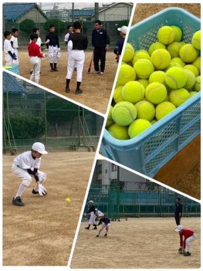 テニスボールを使って、体の正面でキャッチするように練習しています。冬の間の基礎練習をしっかりすると、シーズン時にはさまざまな練習に生かされます。
