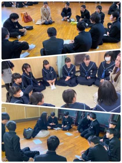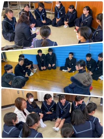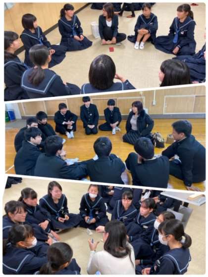それぞれの班に1人ずつ助産師さんが担当し、本音トークや普段できない質問をして答えていただいています。生徒たちの和やかな雰囲気がよく表れています。
