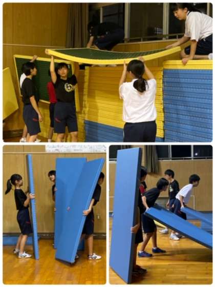 部活動練習後の卓球部と野球部のみんなが、協力して畳を敷いています。