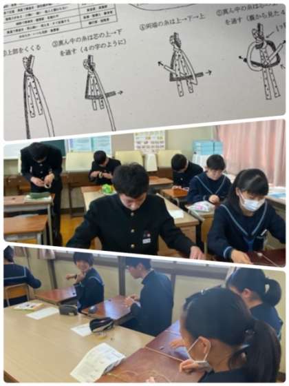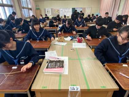 資源や環境に配慮し、生活を豊かにするための製作として刺繍糸の編み物をしています。題材など内容や時間のまとまりを見通して、生徒の主体的・対話的で深い学びの実現を図るよう指導しています。
