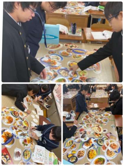 さまざまな料理の写真から、栄養素をみて朝食・昼食・夕食メニューを考えます。好きな食べたいものだけを選んでしまうと栄養が偏ってしまうことがわかるようです。