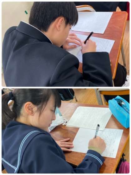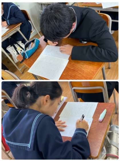 3年生は、卒業文集の作成に取り組んでいます。中学校生活で一番印象に残っていることなどを書いています。