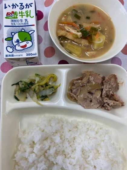 豚肉のしょうが焼き、さつまいものみそ汁、菊菜と白菜のごまあえ、ごはん、牛乳です。