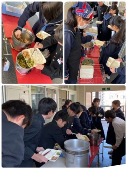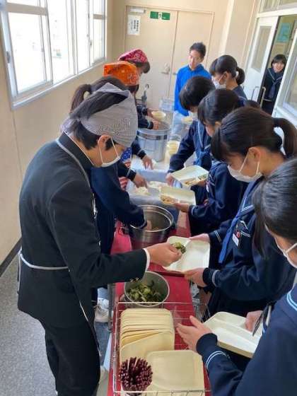 3年生が元気におかわりしています。豚肉のしょうが焼きは、多くの生徒にとって大好物のようです。今日も美味しくいただきました!