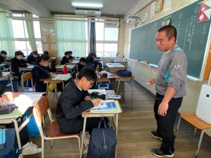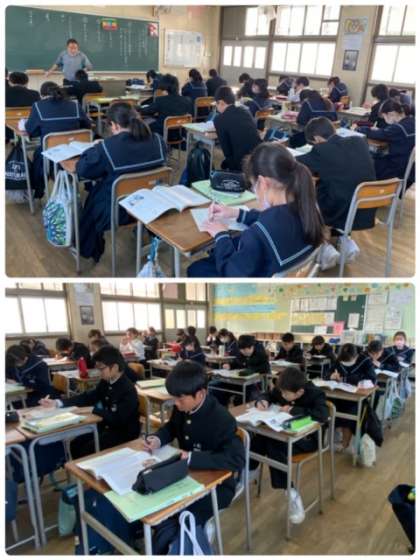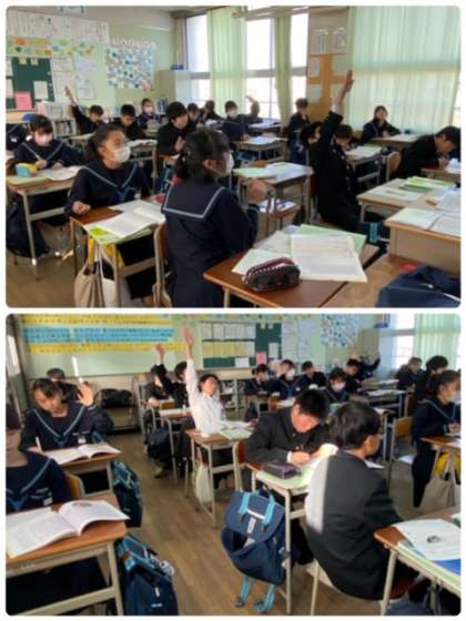 道徳の教科書、ノート、ワークシートを使って学習しています。黒板に掲示するものを工夫して、生徒たちが意見や感想をもちやすいようにしています。積極的に手を挙げている生徒たちがたくさんいます。