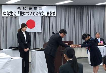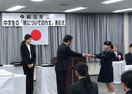 本日、15時30分から城東税務署にて、令和元年度 中学生の「税の作文」表彰式が行われました。本校から3年生女子が見事、税務署長賞を受賞しました。