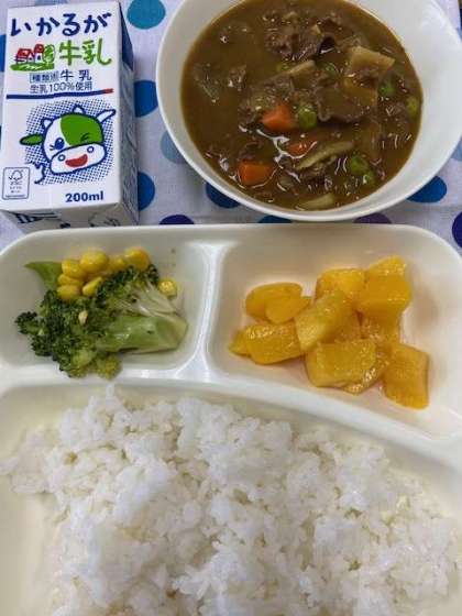今日の給食メニューは、冬野菜のカレーライス、ブロッコリーとコーンのサラダ、黄桃、ごはん、牛乳です。
