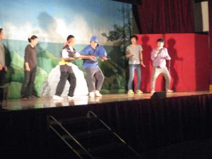引き続いて、本校生徒が杜子春と山賊の衣装に着替え、劇団員の方の指導のもと、劇の一場面を体験させていただきました。