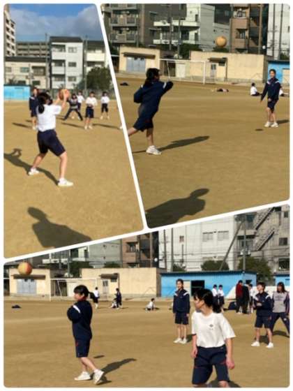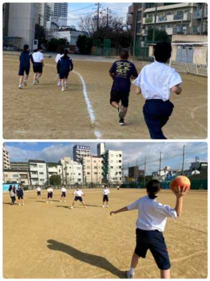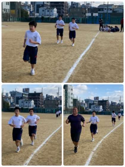 半袖シャツ、ハーフパンツの元気な姿で、激走しています。担任の先生も一緒に走って、生徒に負けないように頑張っています。完走後は、球技を行っています。